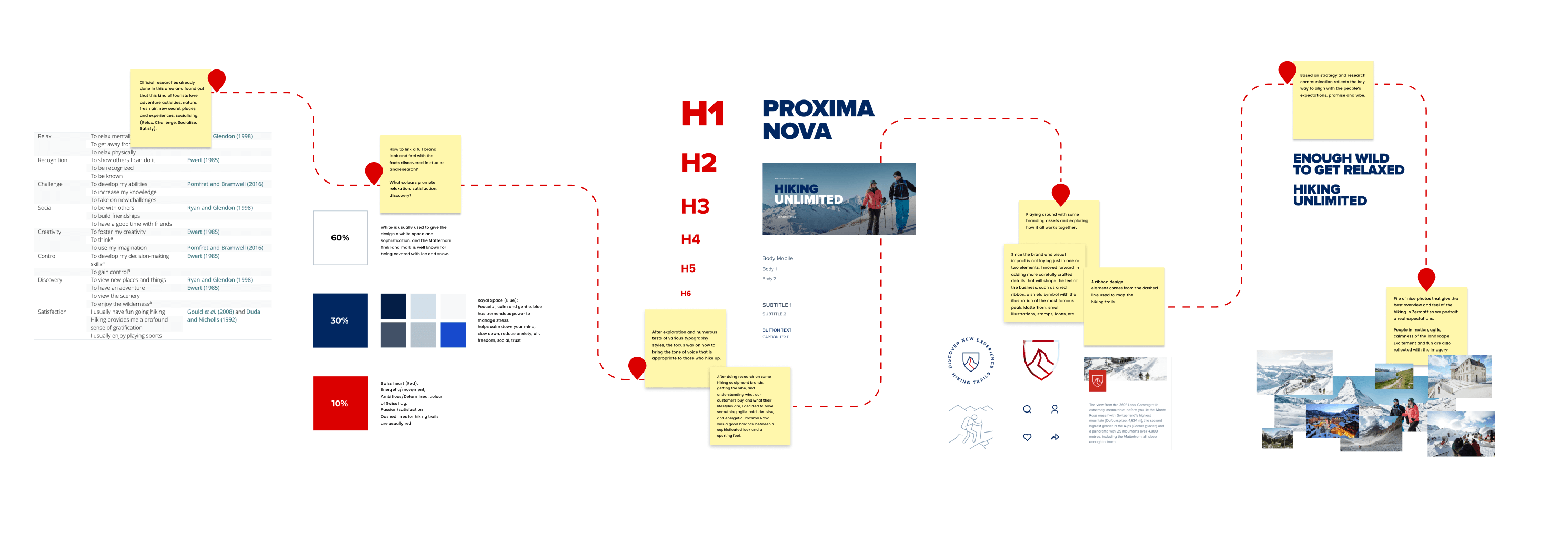 I started setting an art direction by putting the researched insights into the game and portraying an expected vibe, look, and feel. The choice of colours, imagery, typography, icons, illustrations and communication all came from the strategic approach. Relaxing, challenging, socialising, satisfying, trail map lines, a Swiss red heart, and elements of sophistication were the main assets in the final creative direction.